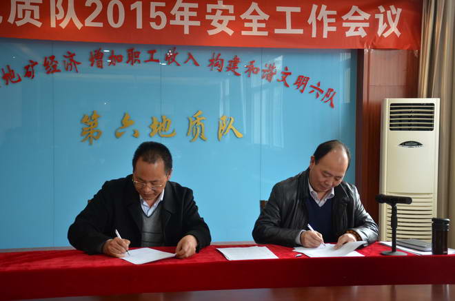 會議四項內容:一是隊長王根寶傳達學習了地礦總公司2015年安全生產與治安保衛工作會議精神;二是主管安全生產工作的黨委書記、副隊長王戰社總結了2014年我隊安全生產與治安保衛工作情況,并對2015年安全生產與治安保衛工作進行了部署;三是隊長王根寶通報了2014年度安全生產與治安保衛責任考核結果,并進行了兌現獎勵;四是與11個實體或部門簽訂了2015年安全生產與治安保衛工作責任書。