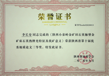 由我公司地調所編制完成的“小秦嶺金礦田深部及外圍金礦整裝勘查區(陜西)礦產調查找礦預測子項目(石門幅)成果報告”獲陜西省第十屆優秀地質成果三等獎;張歡歡同志撰寫的“陜西小秦嶺金礦床三位一體勘查區找礦預測地質模型及找礦意義”獲優秀地質論文一等獎;李長壽同志撰寫的“陜西小秦嶺金礦田石英脈型金礦床石英熱釋光特征及其找礦意義”獲優秀地質論文三等獎。